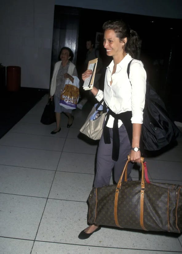 4. Layering for function and style. When I think of on-the-go, travel days come to mind. My husband always likes to get to the airport unreasonably early, so I’m normally scrambling to get ready while finishing some last-minute packing. My favourite styling trick is to throw on an extra layer, usually a sweater tied around my waist—the speediest way to accessorize, quicker than fussing over belts or jewellery, and it serves a purpose, too. I did this when we travelled to New York last fall and wore my sweater when I got cold on the plane, and then tied it around my waist again when it got warm walking around SoHo. The inspiration, of course, comes from so many of the ‘90s airport references.