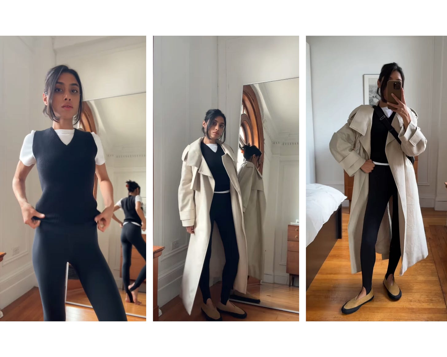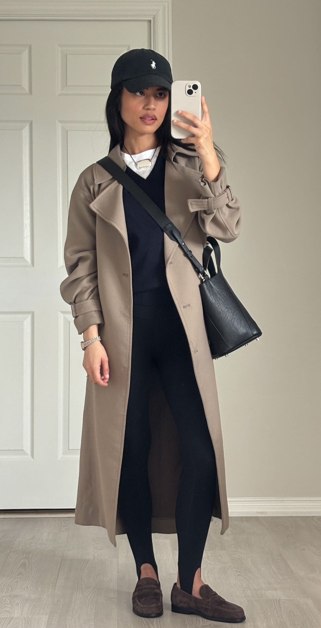 1. Leggings with a bit more polish. The millennial in me always defaults to a pair of leggings when I’m in a rush and striving for comfort. But how I wear them (beyond working out) has slightly evolved from years ago. This look from @shayinjune is my ideal way to style leggings: a pair of stirrups for something a little more fun + a mix of casual (white t-shirt and sling bag) and elevated pieces (a sweater vest, trench, and suede flats).