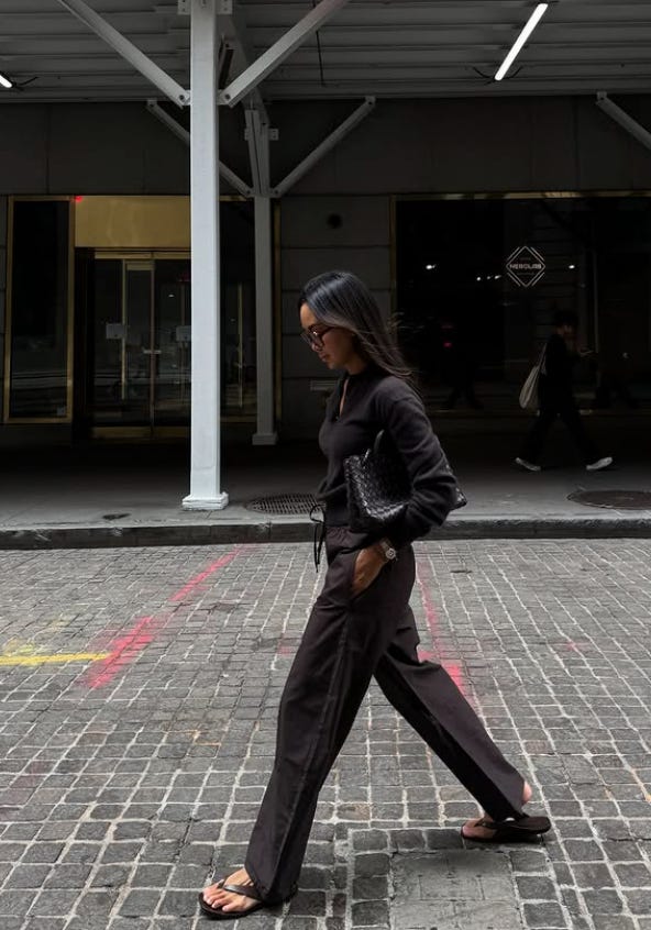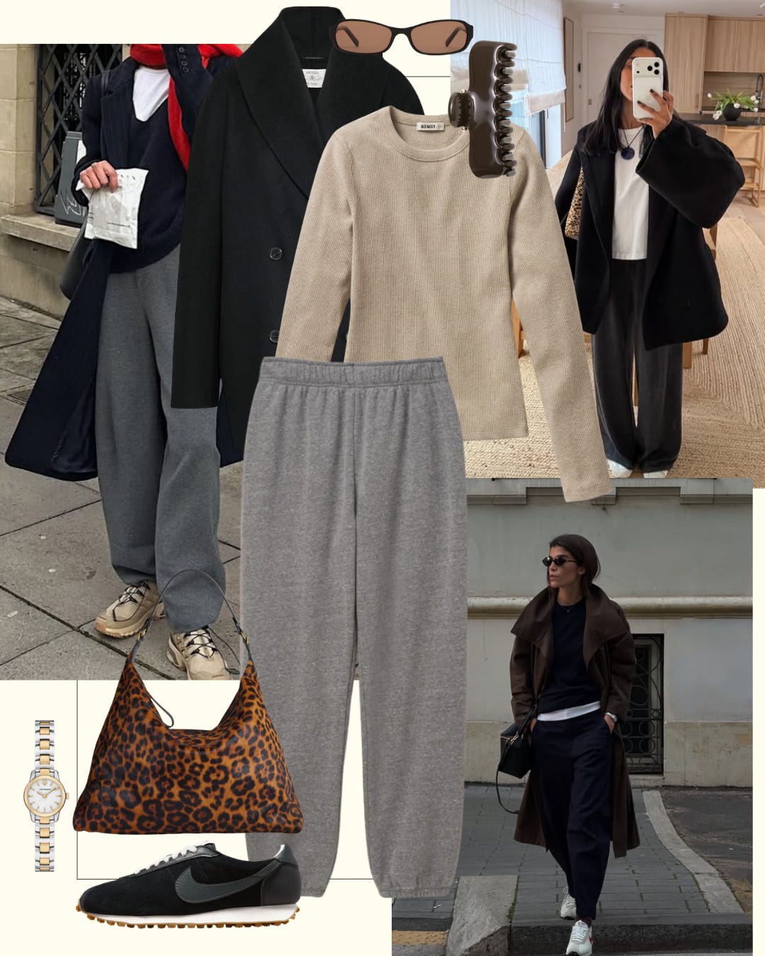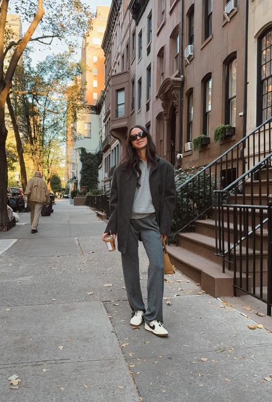 3. Soft pants + an oversized jacket. A pair of loose, drawstring pants or comfortable sweats seems fitting for a day of running around (errands, groceries, kids’ activities, etc.), don’t you think? Although I admit, wearing sweatpants outside of lounging at home can be a tricky one for me—there’s a risk of it looking sloppy. @monikh is a good reference for how I’d want to style them. A lot of the inspo I’ve saved has sweats paired with oversized jackets or interesting coats and cool sneakers, keeping the look relaxed but still intentional.