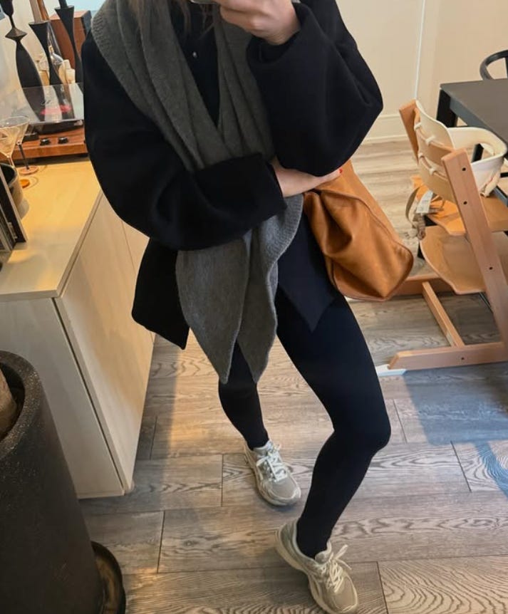 It’s the kind of outfit I’d wear on days I have back-to-back virtual meetings in between school drop-off and pick-up. If a vest isn’t for you, I also like the idea of a belted wrap sweater (this or this) or an oversized turtleneck. Accessories, like a large scarf, sleek tote bag, or an elegant pair of flats, can also help balance the look of leggings from leaning too casual.