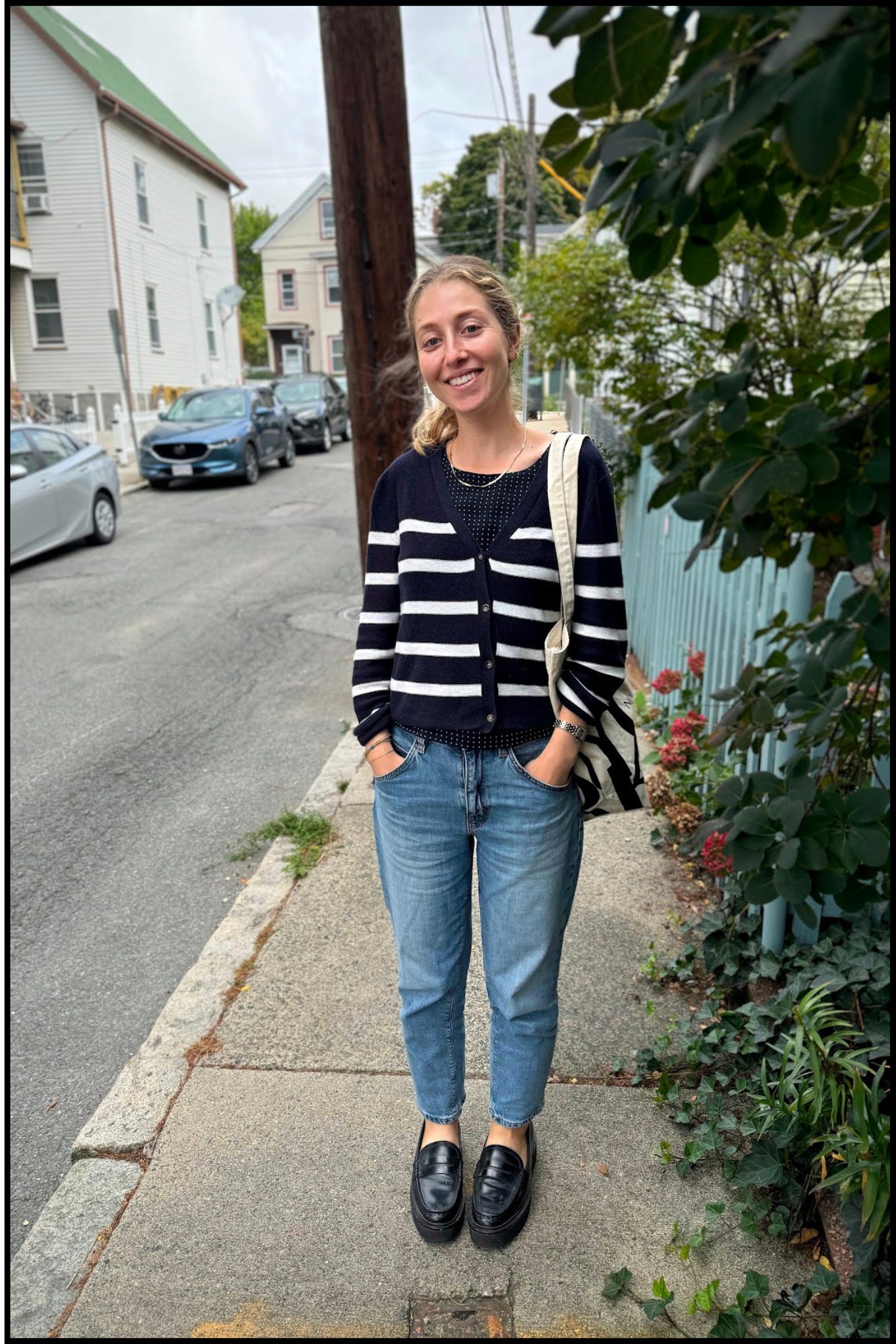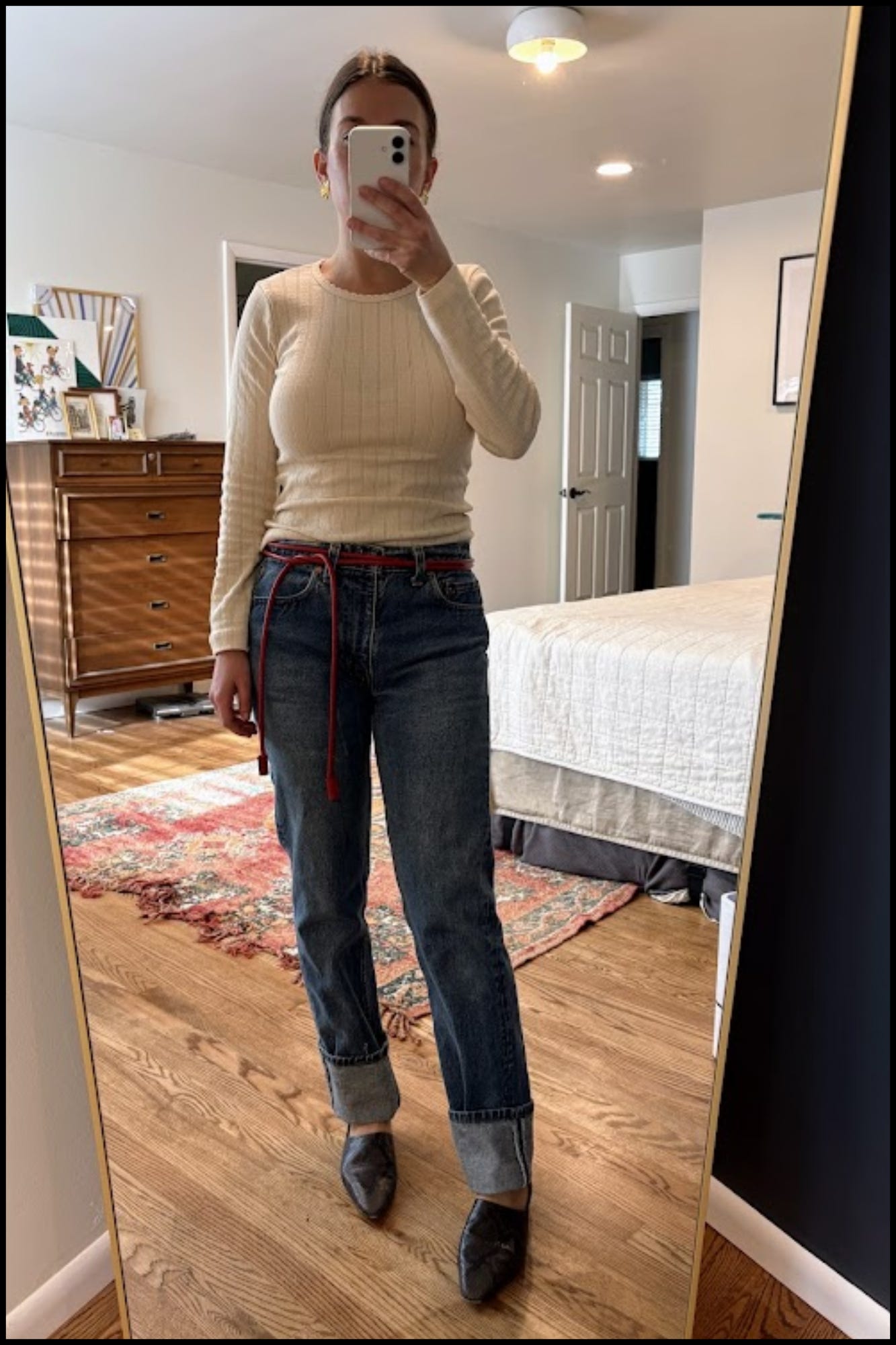 “My weight tends to fluctuate (it is what it is!), so I've learned to spend the most on clothes that I feel good in, whether they're a little tighter or a little roomier. For example, over the last few years I've bought several La Ligne sweaters (the selection on eBay is incredible; seriously, set an alert.) They always fit me well and are so effortlessly chic. Pants, on the other hand? I really try not to spend a lot on pants. Last winter, I was shopping in NYC with my mom and fell in love with a $450 pair of jeans... I restrained myself from buying them and am so glad I did, because I don't think I'd feel as comfortable in them now, and then I'd be mad at myself for buying super expensive denim I didn't want to wear.”