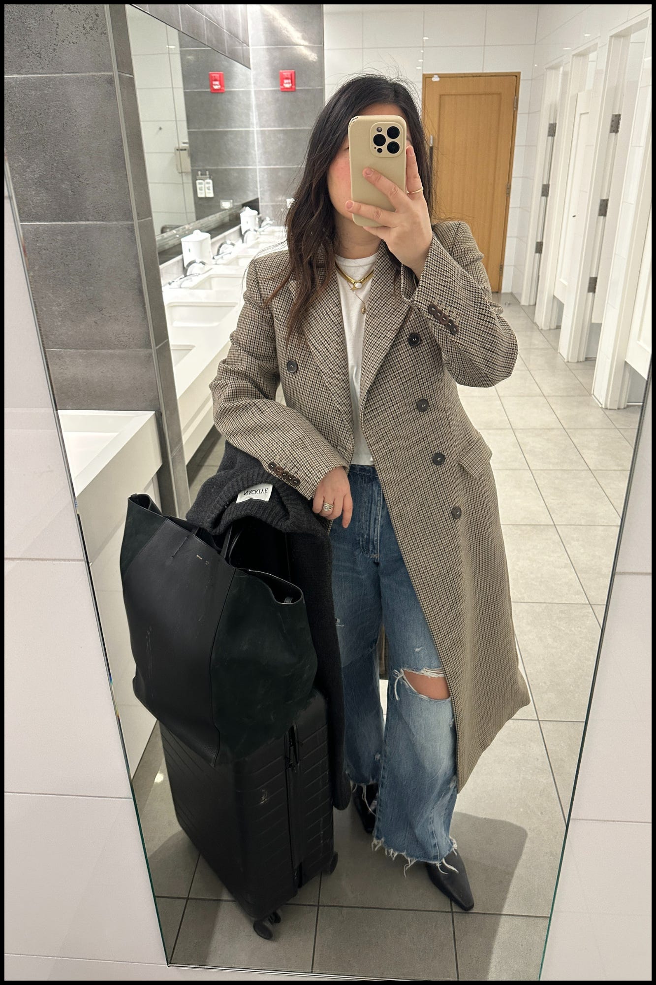 Some pieces I consider to be ‘splurges’ are my AGOLDE jeans, Toteme coat, Chanel ballet flats, and my small collection of designer bags. They’re the pieces where quality stands out to me and they often serve as focal points in my outfits. Whereas I usually try to save when it comes to basic tops (my button-ups are from Zara and T-shirts from Aritzia) and accessories, like jewellery and belts, which I don’t wear as much.