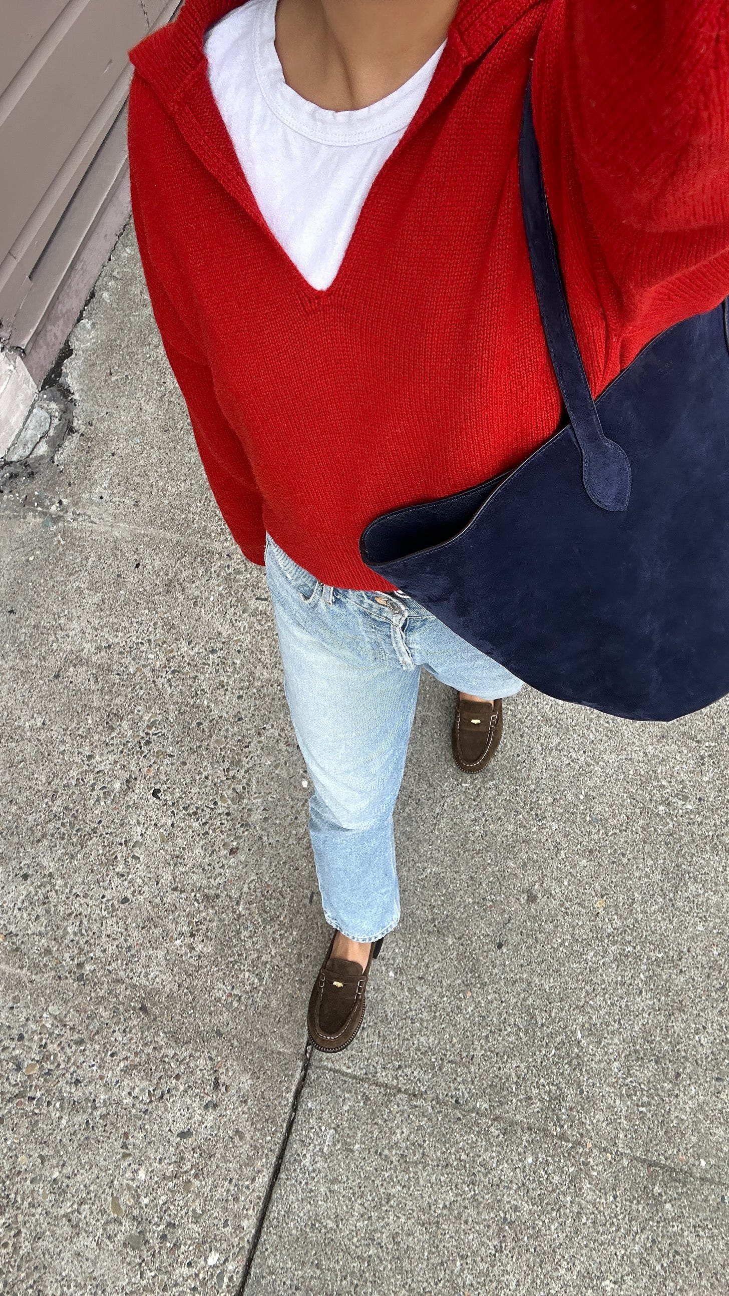 “My go-to outfit for the past month has been playing with variations of a shrunken cashmere v-neck from J.Crew paired with my new favorite Pistola jeans.”