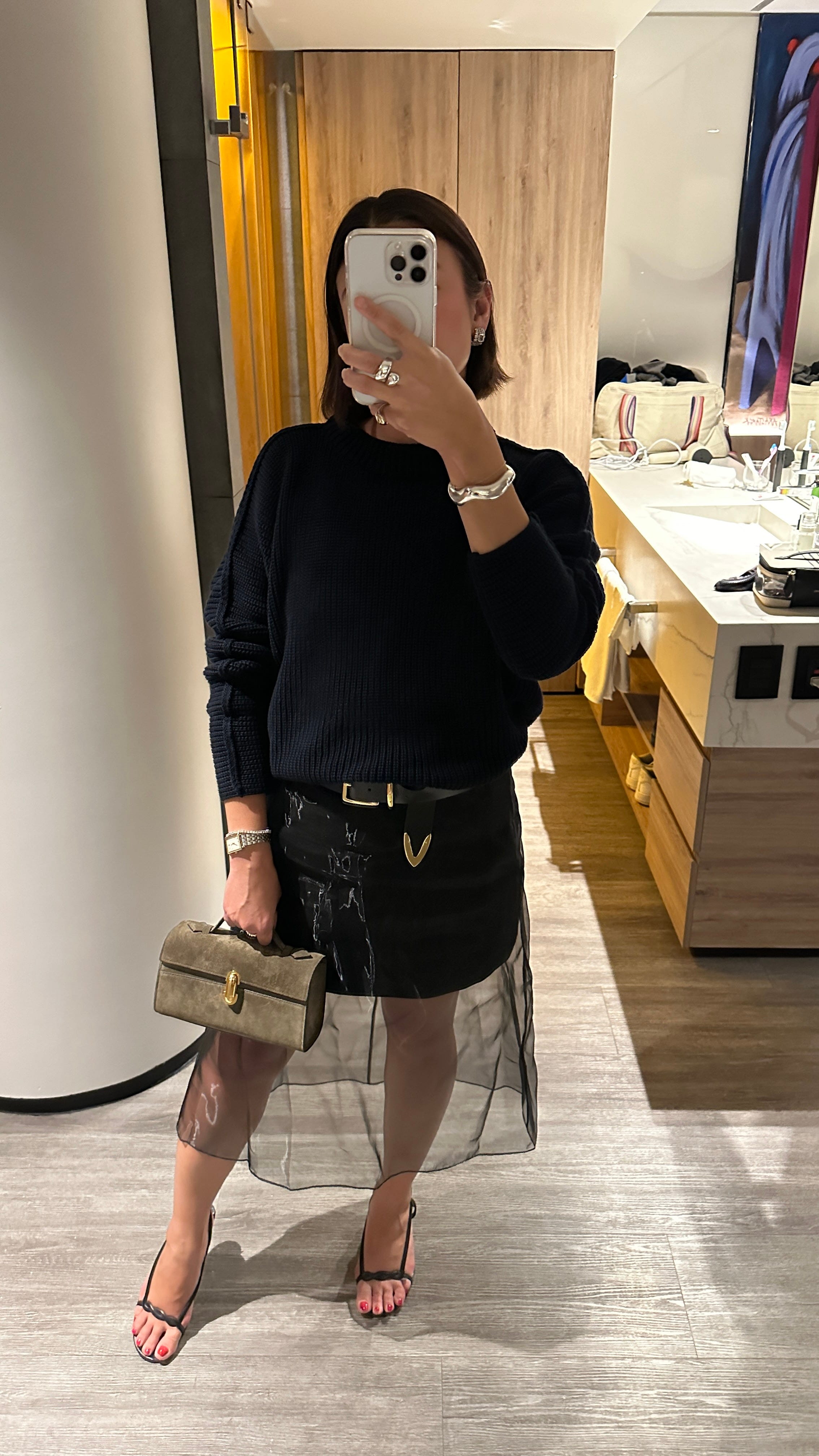 I build from a neutral foundation but rely on what I call ‘personality pieces’ to bring outfits to life. These range from statement jackets to my sculptural Agmes cuff or a vintage minaudière (sourced by Gimi Rarity). My wardrobe spans vintage, secondhand, contemporary, and independent labels. Made-to-order shirts from Chava give me that irreplaceable feeling of perfect fit. For denim, I rotate between vintage Levi 501s with just the right fade, Khaite Abigail jeans (the cut is immaculate), and my latest find: the Pistola Lexi jean, with a perfect vintage-inspired midrise fit.