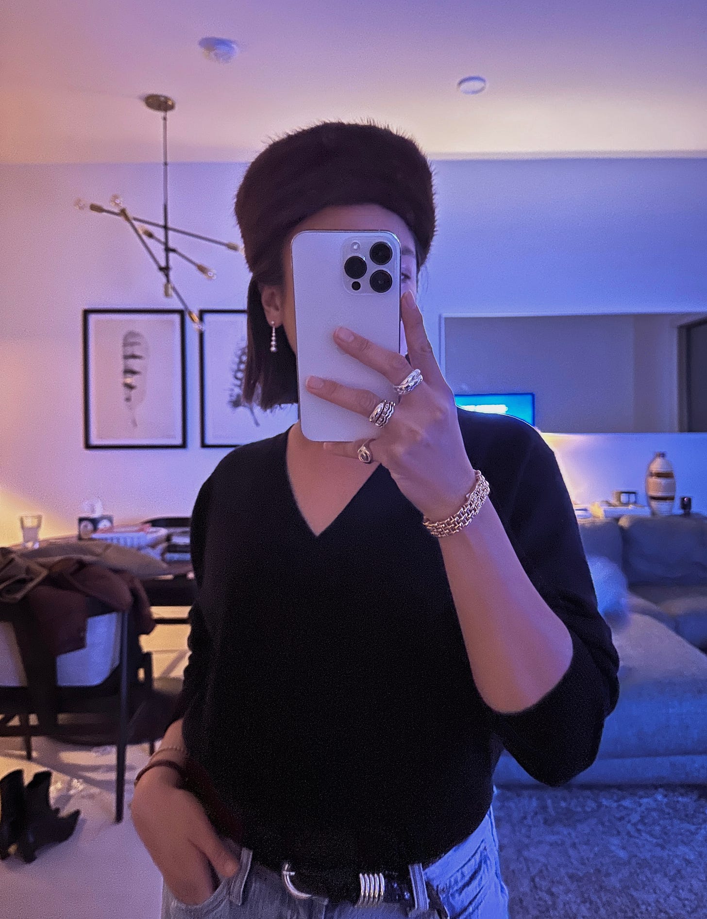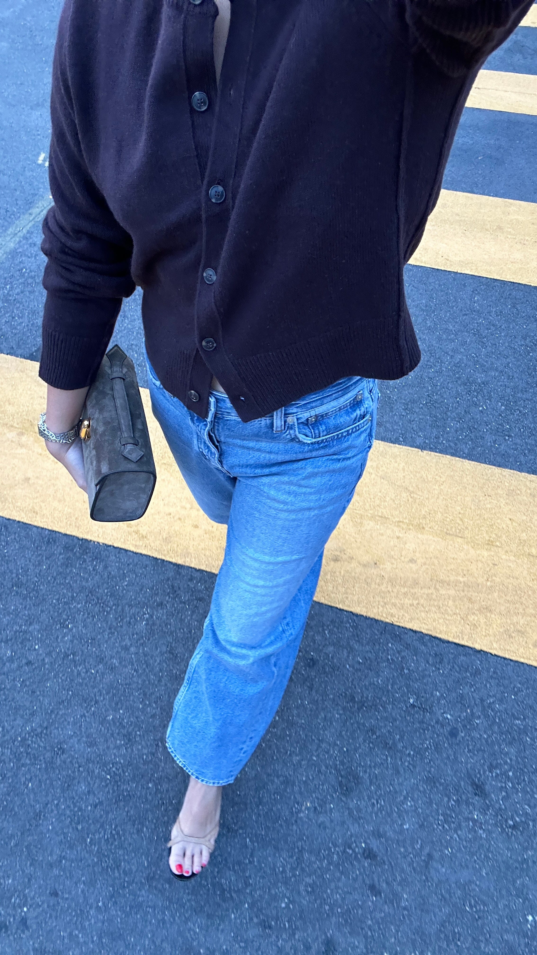 I’ve been leaning into keeping things simple lately. My go-to outfit for the past month has been playing with variations of a shrunken cashmere v-neck from J.Crew paired with my new favorite Pistola jeans.