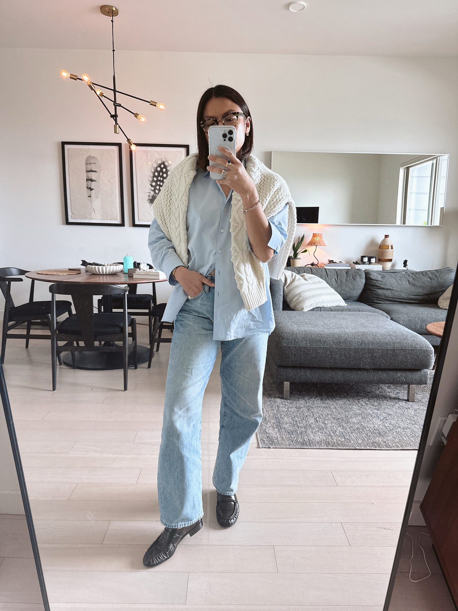 For everyday, I aim for that sweet spot between relaxed and elevated as a uniform: well-worn jeans, an oversized button-up, and leather loafers. Living in SF means the third piece is essential to my style, and I’ve come to love how this necessity for layering shapes my wardrobe. Uniform dressing has been a consistent theme in my style journey — from my grade school and high school years in catholic school to the sleek flight attendant garb during a brief stint in the startup airline world.